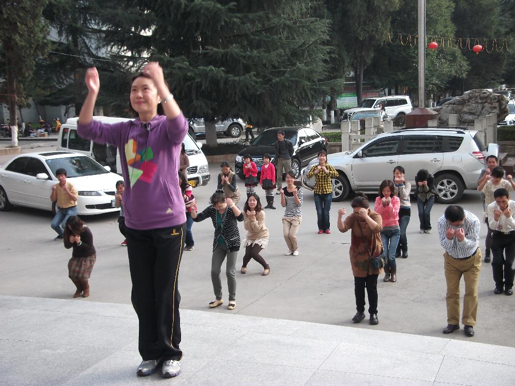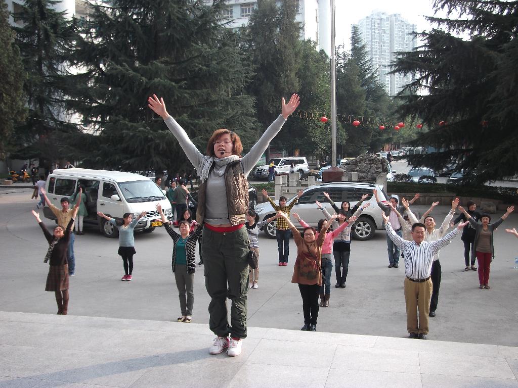 为迎接党的十八大胜利召开,积极响应我校即将举行的全民健身广播操比赛,大学外语教学部工会在党政领导的支持下,于11月2日下午组织全体教职员工进行了广播操普及训练。