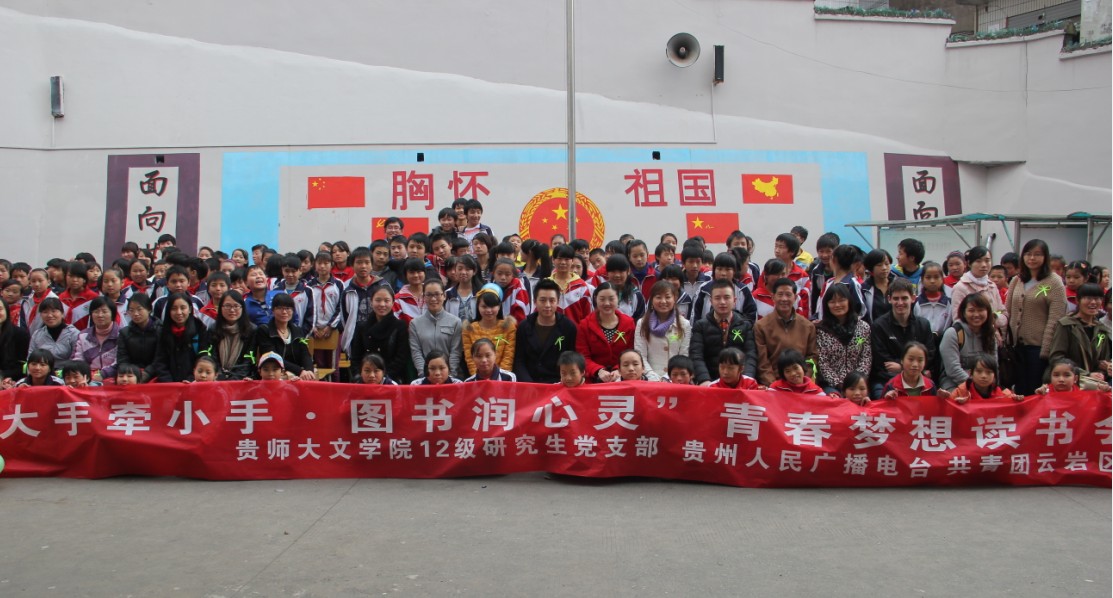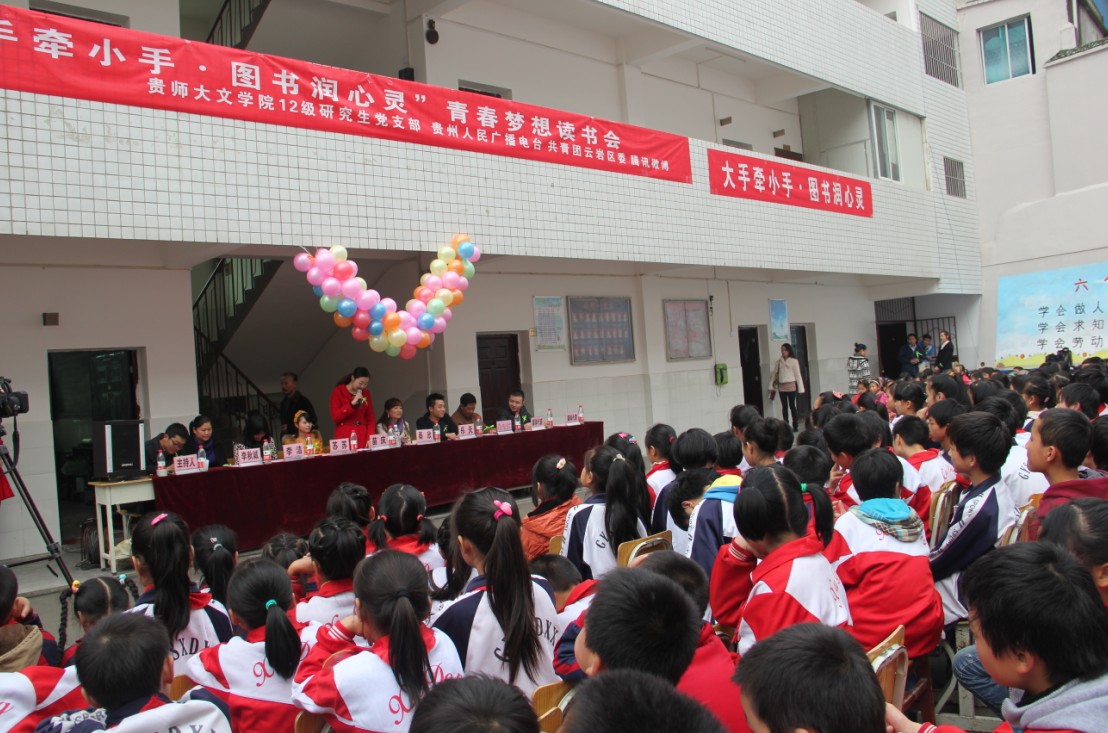 11月9日,正值中国共产党第十八次代表大会胜利召开之际,我校文学院2012级研究生党支部联合贵州广播电视台、共青团云岩区委、腾讯微博(贵州地区)、我校留学生代表在贵阳市旭东学校启动以“大手牵小手—图书润心灵”为主题的青春·梦想读书会公益活动。文学院党委组织员苗庆、共青团云岩区委副书记秦欣、贵州人民广播电台三位节目主持人、腾讯微博贵州地区负责人、文学院2012级研究生党支部30余位党员志愿者及10余名绿丝带志愿者参加了活动。活动由文学院2012级研究生党支部书记傅振同学主持。首批受助对象为旭东学校小学四年级、初中二年级共80余名学生。