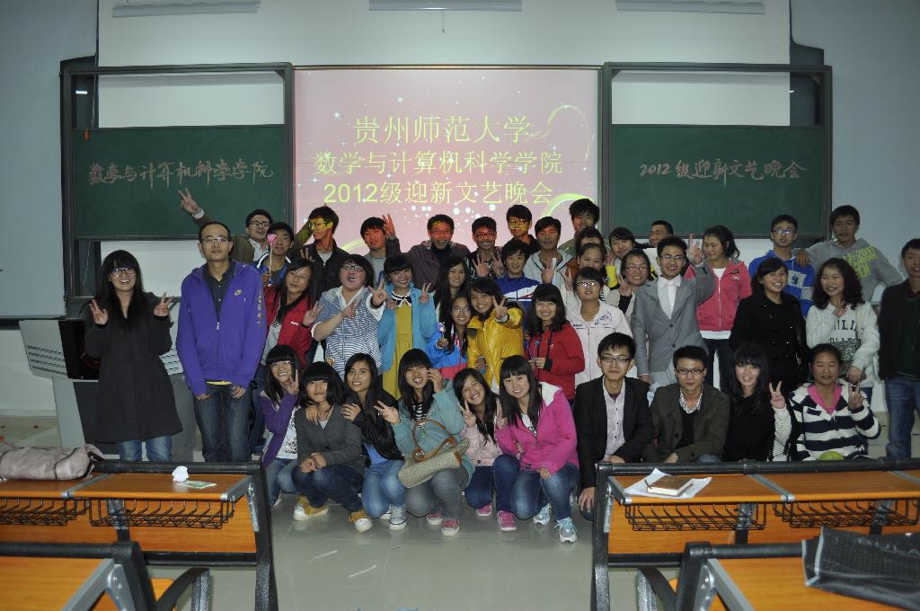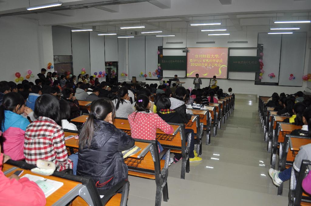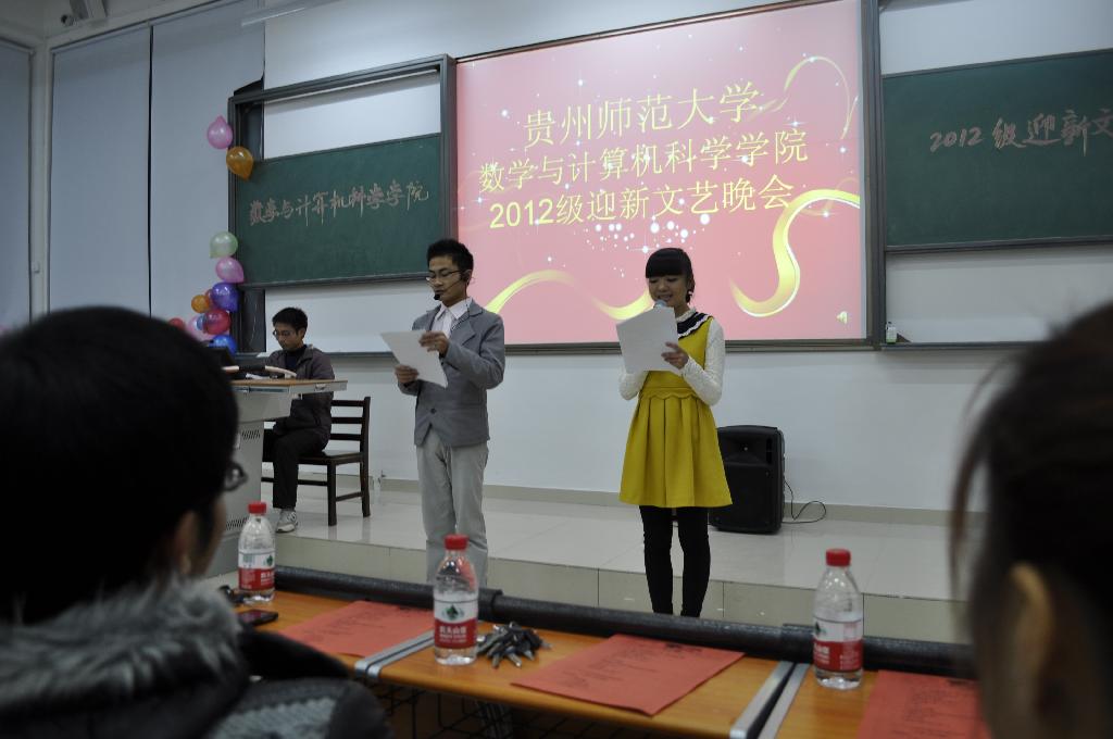 为迎学院2012级新生,展示学院学子风采,丰富同学们的课余生活,践行学校不断创新与丰富校园文化的精神,数学与计算机科学学院迎接新文艺晚会于11月11日晚在花溪校区GJ2520教室举行。校团委胡左高老师、赵捷老师,文学院杨定老师,地环学院朱琳老师等出席。200多名新老生共聚一堂,度过了充满欢声笑语的夜晚。晚会由2012级本科生李如意、张英主持。
