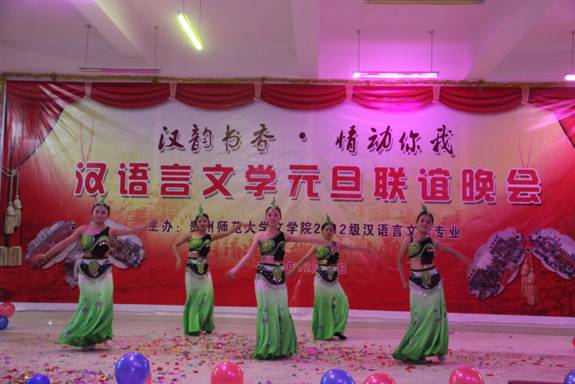 12月24日晚,由文学院花溪校区2012级汉语言文学专业主办的“汉韵书香·情动你我”元旦联谊晚会于公共教学楼隆重举行。校团委、各学院老师以及学院300余人观看了晚会。