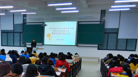 为进一步提高学生干部工作总结、语言表达等能力,促进班级间交流,端正学生考风考纪,12月30日晚,生命科学学院在花溪校区致贤楼GJ2520教室召开学期学生工作总结大会暨期末考风考纪大会。会议由学院团委副书记、2012级辅导员李伟老师主持。