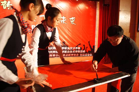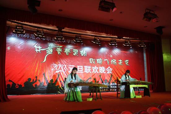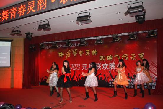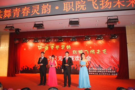 为深入贯彻党的十八大精神,丰富校园文化生活,12月28日晚,由职业技术学院主办、院团委承办的2013年元旦联欢晚会在白云校区求是讲堂隆重举行。院党总支书记胡高荣、院长曾宪林、院党总支副书记印明富、副院长张光明等和学院老师及辅导员到现场观看。校团委邓江老师,材建、国旅等各兄弟院系老师代表、各社团、协会代表应邀前来观看演出,共庆佳节。