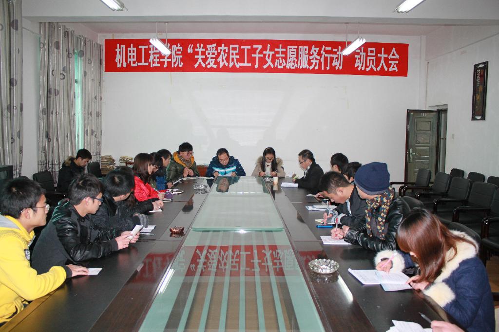 1月6日,机械与电气工程学院在白云校区综合楼会议室召开“关爱农民工子女志愿行动”动员会,动员学生利用假期,切实开展关爱农民工子女活动。学院团委书记杨光复,辅导员李梅以及活动志愿者们参加了此次会议。