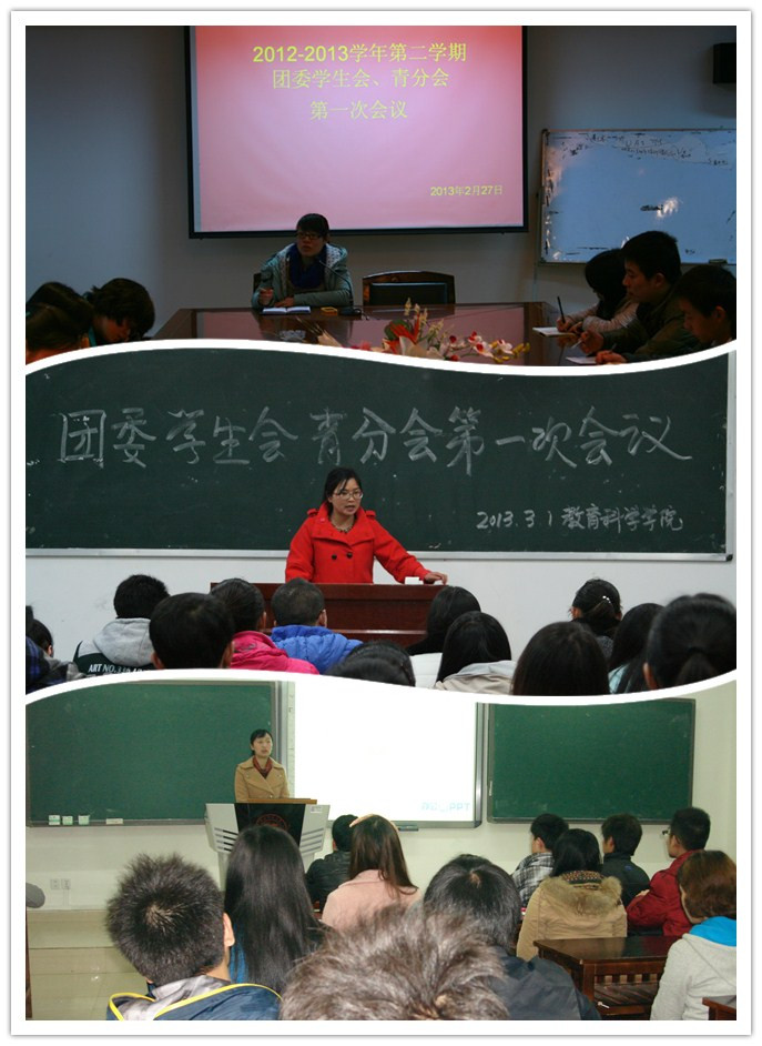 新学期如期而至,为保证学院各项团学工作有序开展,教育科学学院团委于2月27日—3月1日,分别在宝山、白云、花溪三校区召开2012—2013学年第二学期团委学生会、青分会第一次会议。会议分别由院团委书记高阳、副书记王小娅以及白云团委负责人郭腾飞主持,三校区团委学生会、青分会全体成员分别出席会议。