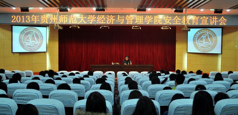 为进一步加强学生的安全防范意识,让学生们在和谐、安全的校园环境中学习与生活,3月15日下午,经济与管理学院分别在白云校区求是学院礼堂、花溪校区GJ2521教室举行了“2013年安全教育宣讲会”,宣讲会分别邀请了贵阳市公安局白云分局贾洪灿警官、我校保卫处王恒科长担任主讲,我院党委组织员赵本喜、2012级辅导员向凯麟出席并主持了宣讲会,经管学院2011级全体同学、2012级全体学生干部聆听了会议。
