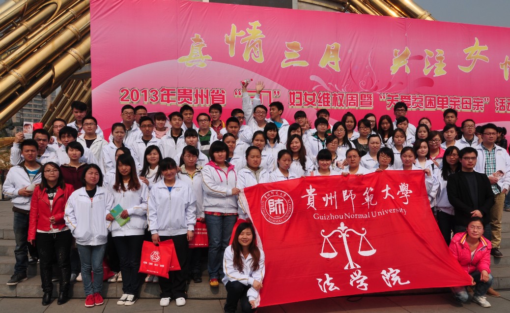 3月8日,贵州省妇联、省综治办、省公安厅、省司法厅省卫生厅、省广播电台、省人力资源和社会保障厅等相关部门联合在筑城广场启动以“真情三月,关注女性”2013年贵州省三八维权周暨关爱贫困单亲母亲活动启动仪式。贵州师范大学法学院为积极响应省妇联号召,在团委书记欧秀松老师的带领70名普法志愿者参与主办方的法律宣传活动。