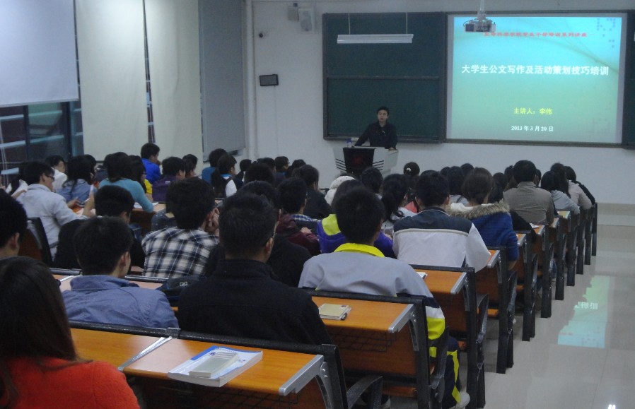 为进一步规范公文写作,着力提升学生干部公文写作及活动策划能力,3月20日晚,生命科学学院在花溪校区GJ3401教室开展大学生公文写作及活动策划技巧培训。讲座由我院团委副书记李伟主讲,我院全体学生干部及其他学院部分学生认真聆听了这次讲座。