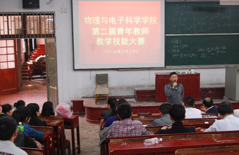 为进一步提升青年教师的教学水平,促进青年教师的快速成长,不断提高教学质量,3月22日下午,物理与电子科学学院在物理楼731教室举行了第二届青年教师教学技能大赛。院长陈世国、院党委书记宇燕、教务处副处长周勋、副院长宋晓书、副书记李应发以及全院教授作为评委参加了大赛。蓄势待发的青年教师们和各年级辅导员以及广大学生们齐聚一堂,准备欣赏一场视听盛宴!