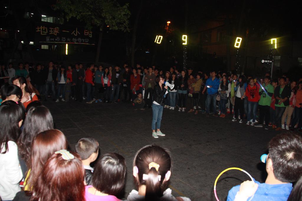 晚上8点半活动正式开始,首先播放了今年“地球一小时”的宣传片和主题歌。之后,主持人和同学们一起倒计时,1栋学生宿舍和10栋学生宿舍的灯相继熄灭。最后,小型露天音乐会将此次活动推向了高潮。