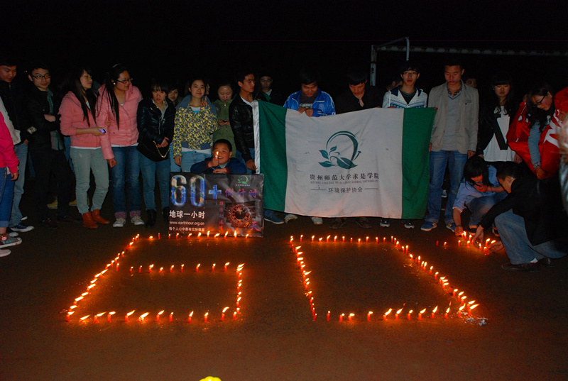 为积极响应由世界自然基金会发起的“地球一小时”节能减排号召,3月23日,由师大团委和求是学院团委主办,贵州师范大学生态环境协会和求是学院环保协会承办的“地球一小时”熄灯环保宣传活动在田径场开展。学院共有80余名志愿者参加。