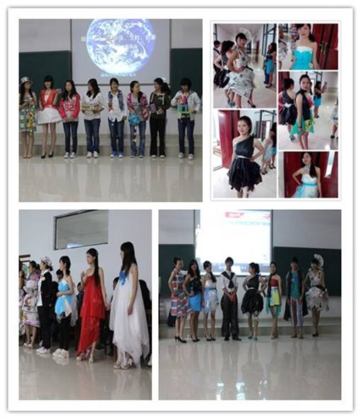 此次活动主要以服装秀和工艺品展示为主。在观看完地球一小时宣传视频后,服装秀正式拉开帷幕。亮丽的环保服装是用废旧材料做的,有军训服装、旧横幅、报纸甚至是塑料袋等。