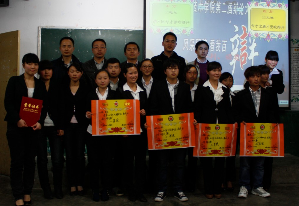 决赛分上下两场,分别就“先成家还是先立业”和“专才与通才谁更吃得开”进行辩论。高潮迭起,惊喜不断,辩论双方短兵相接,互不示弱,或气势逼人,或机智诙谐,从多角度多层面对辩题进行了深刻的诠释与剖析。紧张激烈的比赛现场,淡定从容的参赛选手,赢得了场下同学的阵阵掌声。经过两个小时的决赛的紧张角逐,最终2011工造、2011电气和2012学前教育分别获冠军、亚军和季军,2011电气刘廷秀同学荣获“最佳辩手”称号。