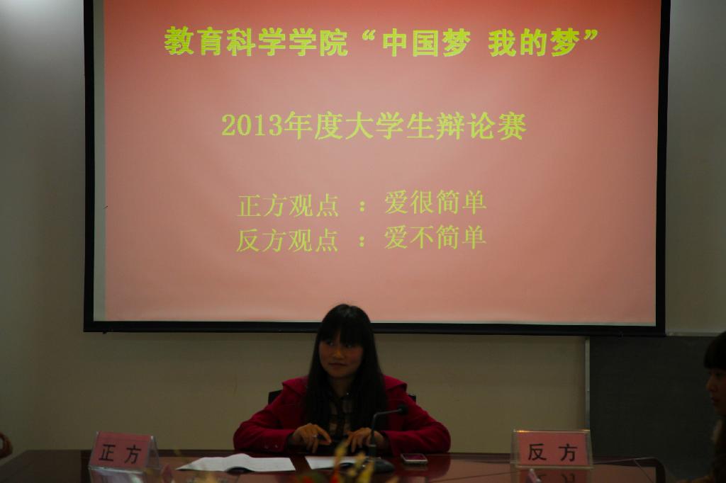 为了把学习宣传贯彻党的十八大精神与校园文明建设相结合,2013年4月12日中午,教育科学学院在田家炳七楼会议室举行“中国梦·我的梦”大学生辩论赛,来自三个校区的四支代表队参加了比赛。
