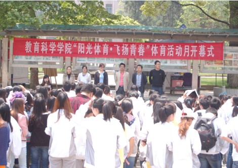 4月17日中午,教育科学学院“阳光体育 飞扬青春”体育活动月开幕式在白云校区篮球场举行。教育科学学院党委组织员吴嘉佳及相关学院辅导员出席。学院白云校区2011级全体学生参加。开幕式由辅导员龙女主持。