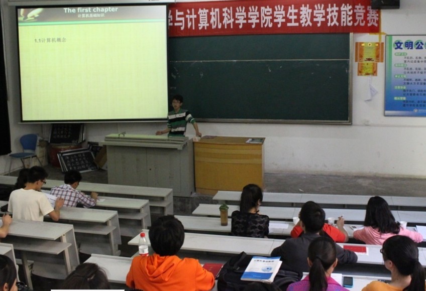 教学技能比赛分为理科数学组和职教组,学生自由组队,每队由五名队员组成。比赛分即兴演讲、授课、评课、问答4个环节,邀请了学院优秀老师担任评委。