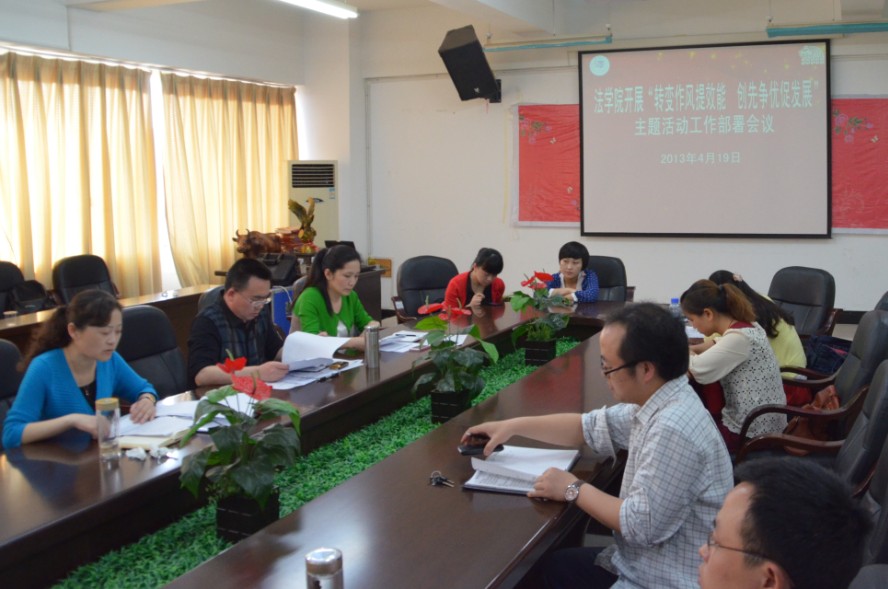 4月19日,法学院在会议室召开“转变作风提效能,创先争优促发展”主题活动工作部署会议。法学院党委书记蒙黎明、院长潘弘、党委副书记林也婷、副院长李运才、文永辉,以及法学院全体教师党员和部分学生党员参与此次会议,会议由法学院党委副书记林也婷主持。