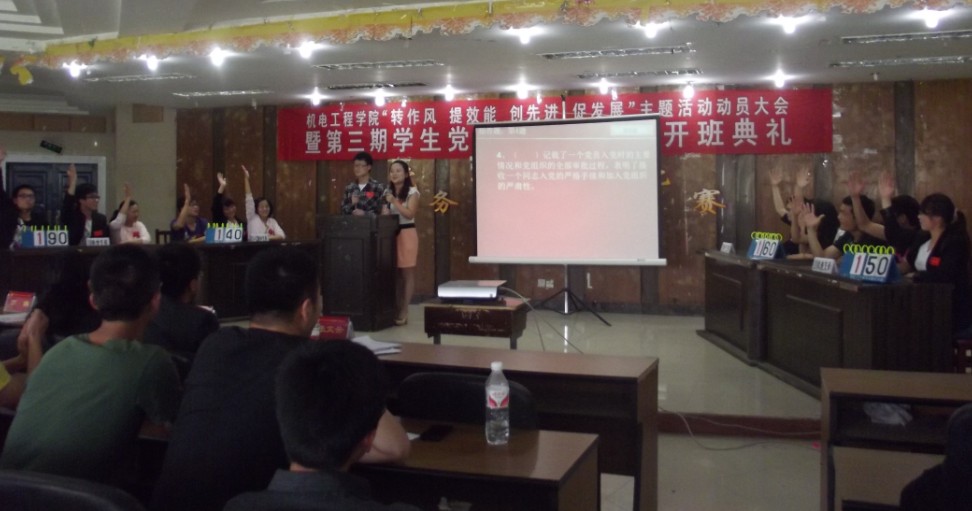 4月19日下午,机电工程学院党委举办学生党务工作能力比赛。本次比赛系学院第三期学生党务工作培训班活动项目之一,在前两期培训班取得成功的基础上,本期培训班积极创新活动方式,鼓励由支部委员和学生党员组成的4支队伍参加了比赛。学院党委书记陈椽、副书记黄平惠、党委秘书张文云、支部书记贺曲、李芳观看了比赛。