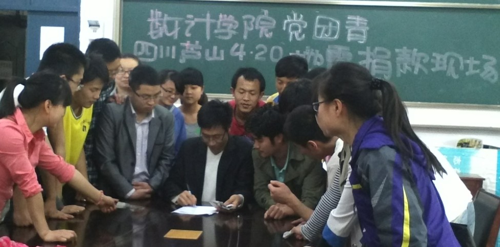 4月27日中午,数计学院在党员活动室,组织广大学生党员、青年团员为“四川芦山4.20地震”举行了捐款活动,截止本日下午4:20,共收到来自宝山、白云、花溪三校区捐款2985.3元。