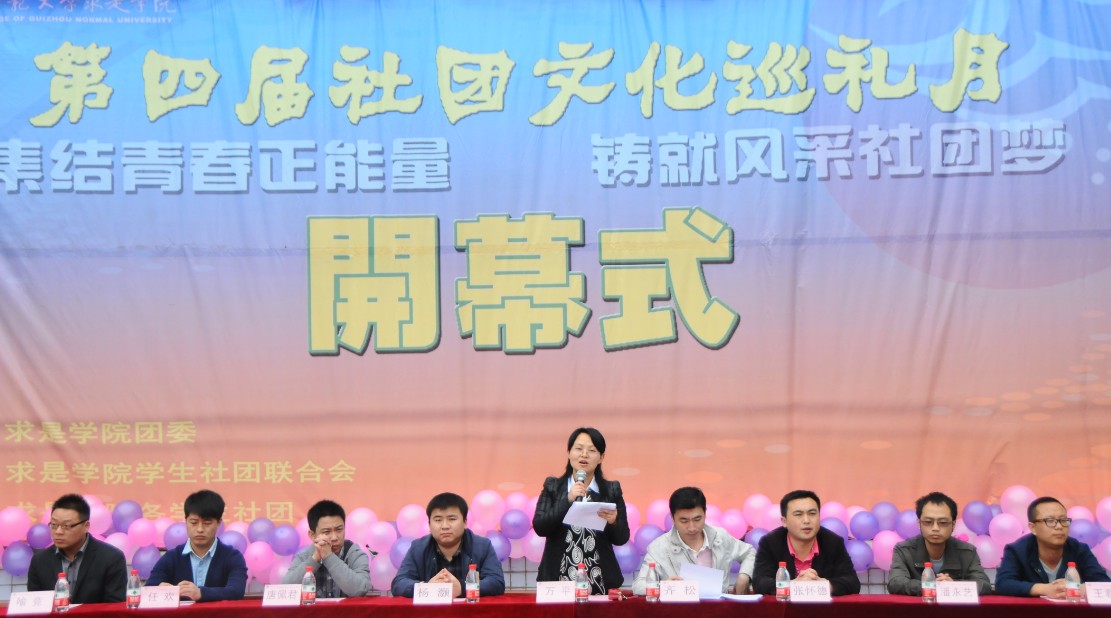 5月7日,我院第四届社团文化巡礼月“集结青春正能量 驿动风采社团梦”在求是广场开幕。我院党委副书记万平,团委书记、学工部部长齐松,学工部副部长杨灏,学院团委副书记张怀德以及各系团总支书记、各社团指导老师出席。各社团成员代表及贵州师范学院社联代表300余人参加了开幕式。