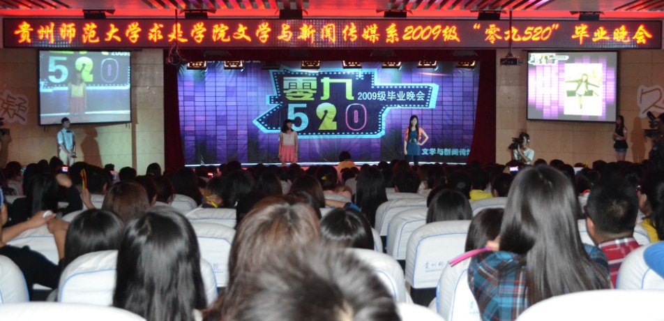 5月20日晚,文学与新闻传媒系2009级“零九,520”毕业晚会在求是讲堂隆重举行。院长张静,党委副书记万平,副院长李绿山,团委书记兼学工部部长齐松,学工部副部长杨灏,文传系行政主任帅永平、教学主任李玉芬和学院相关系部老师,文传系师生亲临现场为文传系2009级毕业生道别。