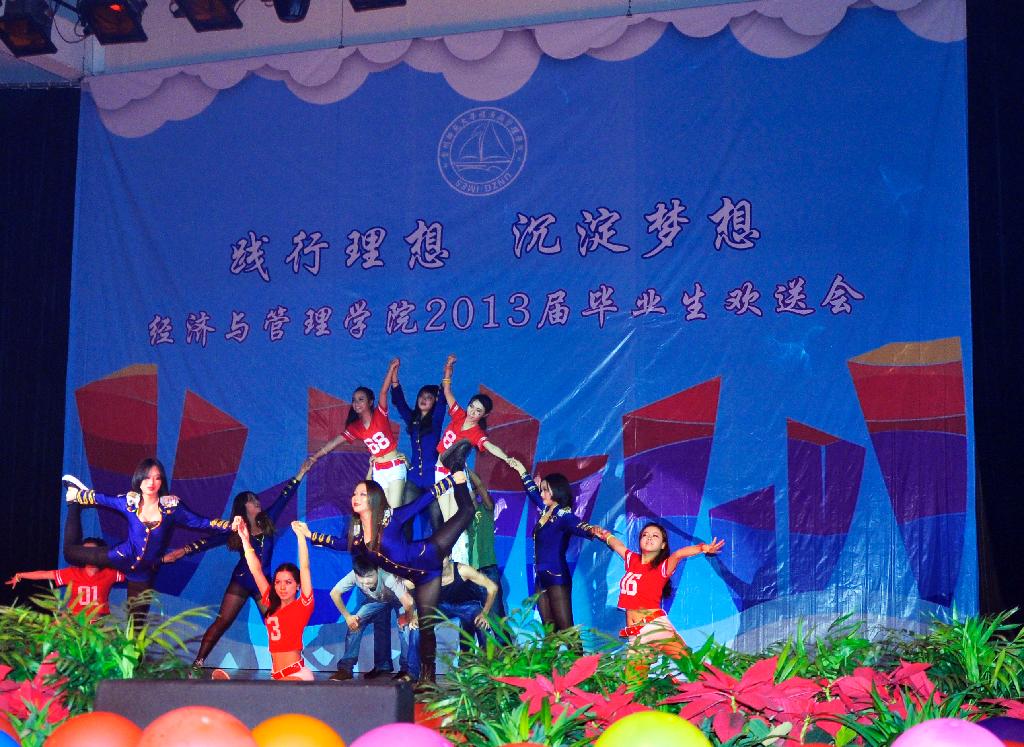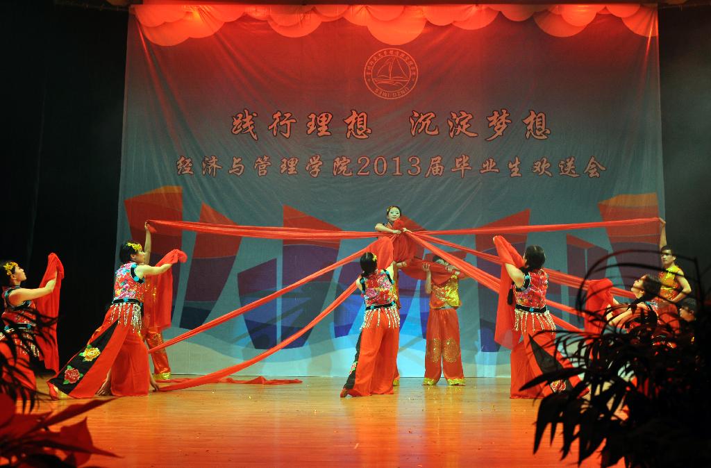 欢送会在活力十足啦啦操《篮球宝贝》中拉开帷幕。学院艺术团印度舞《异国神韵》充满浓厚的异国风味,演员们轻飘浮动的丝带、摇曳的身姿、优美的动作将印度舞的神韵展现得淋漓尽致,让在场观众仿佛身临其境,陶醉在异国风情当中;而红色舞蹈《黄河颂》,则以截然不同的风格,完美的造型,整齐的舞步,为大家展示出五彩斑斓的青春画面;2010级学生会爵士舞《Hot summer》,给大家带来不一样的青春感受;2011级电子商务专业《面朝大海,春暖花开》激励着毕业生们继续奋斗;青年教师歌曲串烧《青春舞曲》点燃了现场的激情,把大家带入回忆青春的点滴之中;2010级公共事业管理专业歌舞剧《梦想社》形式多样的歌舞,欢快的曲调,令人心情激荡,让在场观众思绪万千。欢送会气氛热烈、高潮迭起、精彩纷呈,为2013届毕业生送上最美好的祝愿。