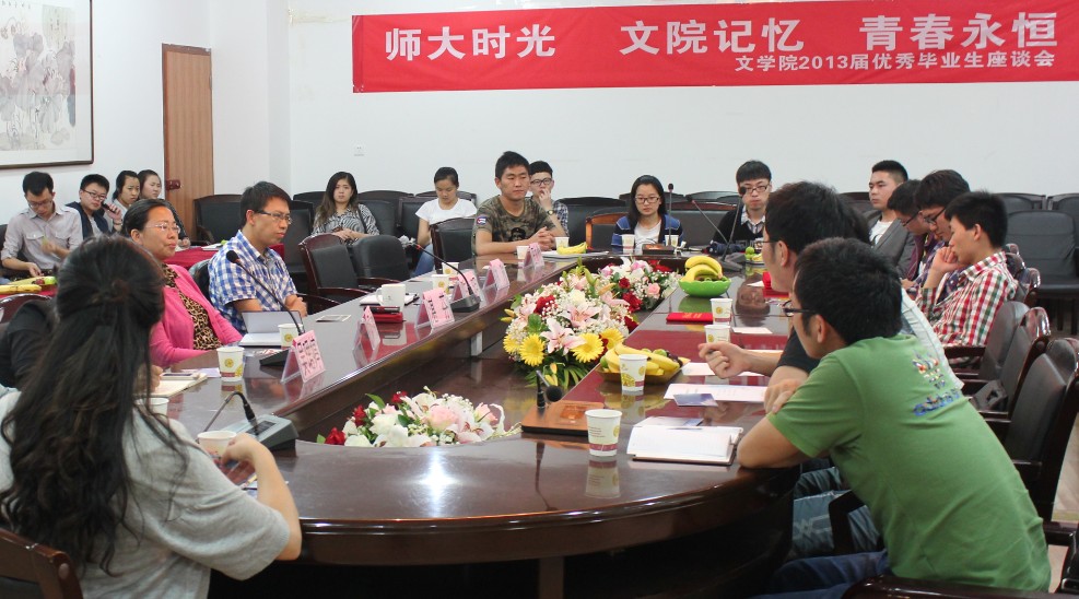 5月29日,以“师大时光 文院记忆 青春永恒”为主题的文学院2013届优秀毕业生座谈会在宝山校区文科楼四楼会议室举行。院党委副书记陈明、副院长湛芬、院团委书记林琳,毕业班辅导员刘可文、王永伦、吴珺婷和优秀学生代表参加会议。