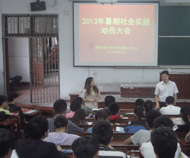6月6日,物理与电子科学学院团委、学生会在物理楼731教室召开2013年暑期社会实践活动动员大会。院党委副书记李应发出席并讲话,他就大学生暑期社会实践的多样性和对大学生所起到的积极意义作了相关阐释并鼓励同学们利用好暑假时间,多做有意义的事。我院2011级全体学生干部参会,会议由院团委书记秦欣主持。