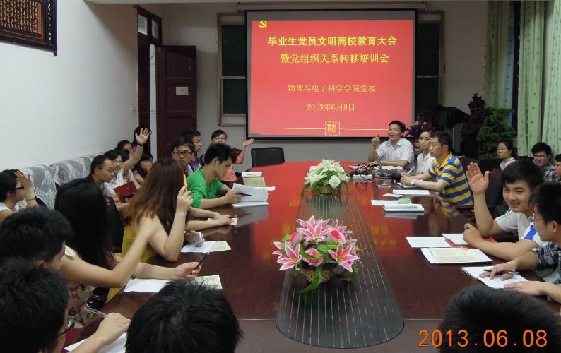 6月8日,物理与电子科学学院党委召开了2013届毕业生党员文明离校教育大会暨毕业生党组织关系转移培训会。院党委副书记李应发、毕业生党支部书记杨洋及60余名毕业生党员参加。赵翠华主持会议。
