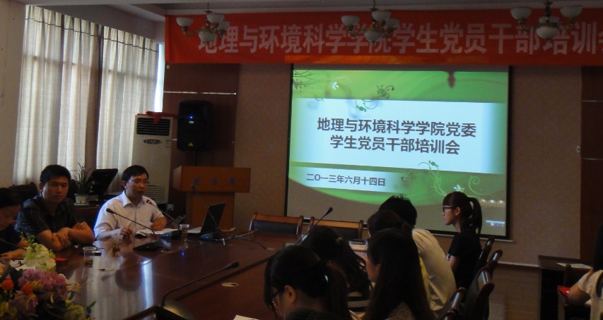 6月14日下午,地理与环境科学学院在五楼会议室举行2013年学生党员干部培训会,特邀学校机关党委书记罗税老师授课,学院党委副书记田伟、组织员郭锐、辅导员周越、朱琳、王磊、学生支部委员和学生党建中心干部共50余人参加培训。会议由郭锐主持。