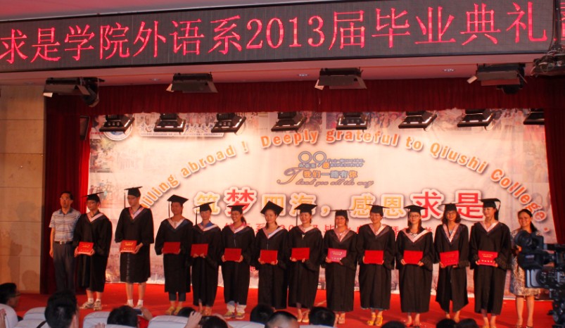 6月19日,求是学院外语系2013届毕业典礼在求是讲堂隆重举行。学院党委书记战勇、院长张静、副书记万平、副院长杨晓英、李绿山,组织员田茂超、帅永平,各系团总支书记、辅导员、部分任课老师代表,外语系全体教师及400多名毕业生参加了典礼并观看演出。典礼由外语系行政系主任王晓梅主持。