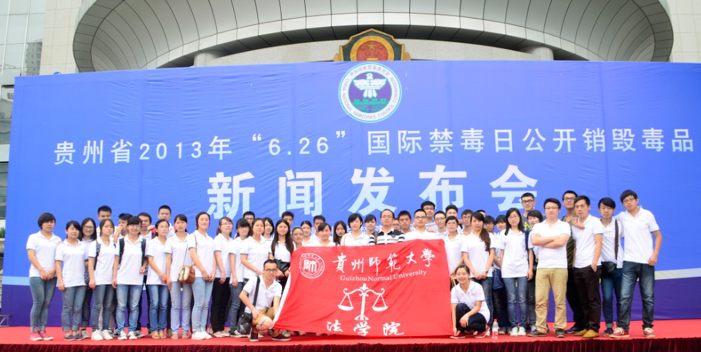 6月25日,省人大、省禁毒委员会、公安厅在贵州省公安厅召开贵州省2013年“6.26”国际禁毒日公开销毁毒品新闻发布会,贵州省人民政府党组成员、省委政法委委员、省长助理、省公安厅厅长孙立成,省禁毒委副主任、省禁毒办主任、公安厅党委副书记、副厅长赵翔出席新闻发布会并作重要讲话,省人大法制委、内司委、警保部、督察总队、治安总队、交警总队、禁毒总队、省禁毒委成员单位的负责同志和厅属有关单位的同志、省禁毒委成员单位禁毒联络员、贵阳市公安局特警支队等有关部门负责人、贵州师范大学法学院团委书记欧秀松带领法学院党员和优秀团员组成的50名普法志愿者参与活动。