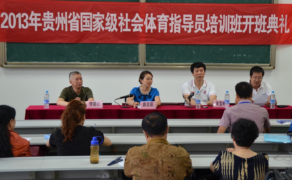 根据《体育总局办公厅关于开展2013年国家社会体育指导员培训工作的通知》群体字〔2013〕29号及《关于举办2013年国家级社会体育指导员培训班的通知》黔体群字〔2013〕15号文件要求,在国家体育总局和贵州省体育局指导下2013年贵州省国家社会体育指导员培训工作在我院开班,6月25日上午举行了开班典礼,省体育局社体中心主任李建红,群体处处长朱宝林,我院党委书记路言莉以及来自全省各个地州市的65名学员参加了开班典礼。我院办公室主任杨中兵主持开班仪式。