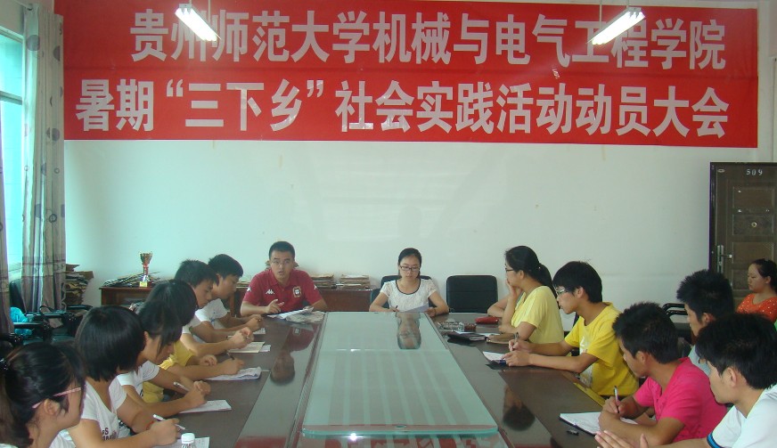 李梅老师首先给队员们讲解了暑期“三下乡”社会实践活动的由来、意义及相关政策,并就此次社会实践活动的地点——黔东南丹寨县杨武乡的具体情况做了介绍,对企业调研、义务家电维修、教务帮扶等活动内容进行了详细部署。张文云老师针对活动期间的党建交流内容做了具体安排,并宣读了院党委《关于在2013年暑期“三下乡”社会实践青年突击队中成立临时党支部的通知》。随后,邢丹花老师、李芳老师也相继发言,强调了三下乡期间的纪律和安全问题,并表达了对志愿者们参与此次社会实践活动的殷切希望和美好祝愿。