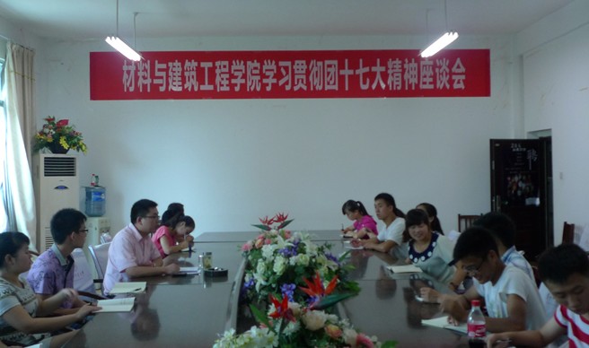为深入学习贯彻团十七大精神,7月10日中午,我院在综合楼206会议室召开了以“高举团旗跟党走 奋力实现中国梦”为主题的学习贯彻团十七大精神座谈会。学院团委书记刘江老师、各班级团支部书记、团员青年代表等20余人参加会议。会议由刘江老师主持。