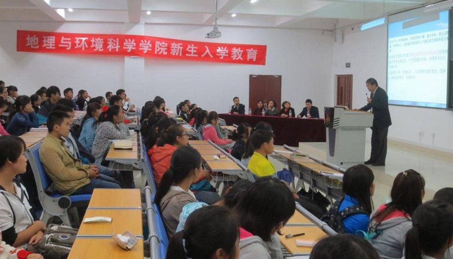 9月25日晚,学院开展了第二阶段的新生入学教育活动。学院党委书记杨建红、院长安裕伦、副书记田伟、副院长赵翠薇、组织员郭锐及各学科系主任、办公室主任、团委书记一行齐聚花溪校区,为我院全体新生带来了一场精彩、深刻的见面会暨专业入学教育。安裕伦首先就学院的建设发展、专业设置、师资力量及科研成果进行了详细的介绍,强调学院在硬件和软件上都为新同学提供了良好的学习生活环境,同时提出 “如何认识大学?、如何认识师大、如何上好大学”三个问题引发全体新生深思,并以此为内容为新生做了详细、深刻的诠释。赵翠薇针对学院研究生教育,从招生专业、招生情况、导师师资队伍及研究生就业去向等做了十分详细的介绍和解答,鼓励广大新生从现在开始,加强学习能力,树立目标,争取毕业后向更高学术层次深造。最后,杨建红在发言中,用大量承载着深厚历史轨迹的老照片,向新生讲述了师大及地环学院发展的悠久历程,深刻解读了“什么是大学精神”,继而认真诠释了校徽、校训、院徽、院训的含义,并向全院新生寄语了殷切希望、提出了几点要求,鼓励全院新生在追寻梦想的道路上迈出坚毅的步伐。