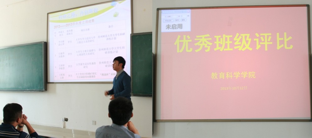 根据学校2012—2013学年评优工作的相关要求,结合我院实际,为进一步增强班级凝聚力,深化集体荣誉感。10月12日,教育科学学院在花溪校区GJ3211教室 举行2012—2013学年度优秀班级评选大会。学院党委副书记罗洪刚老师、党委组织员吴嘉佳老师、党委秘书杜吉娴、团委书记高阳老师、团委副书记王小娅老师及各班辅导员出席并担任评委。评选大会由王小娅老师主持。