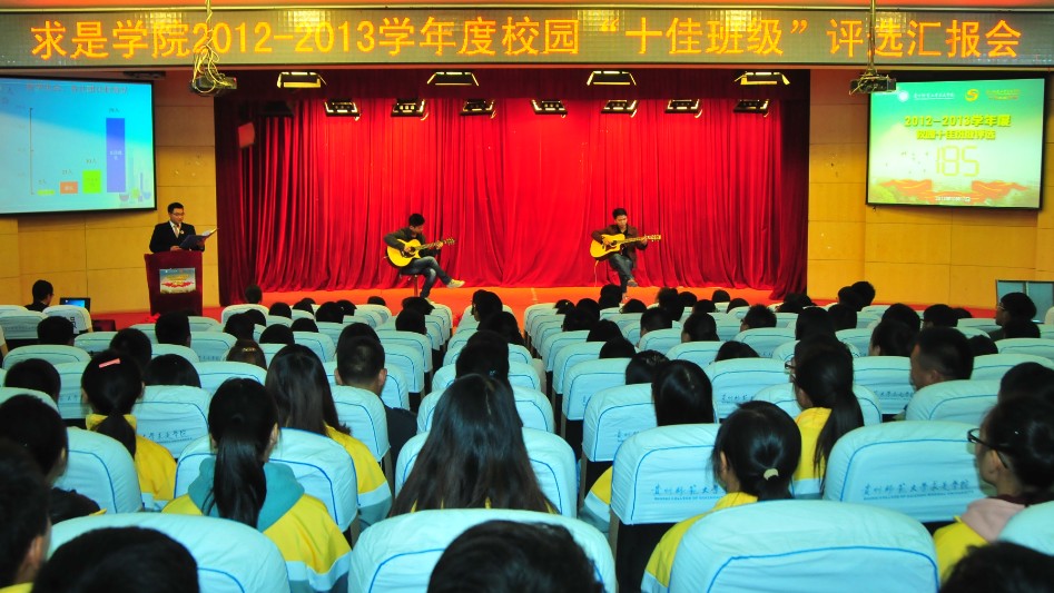 10月17日晚,求是学院在求是讲堂举行2012——2013学年校园“十佳班级”评选汇报会。校学生工作部副部长胡长华,求是学院党委副书记万平,副院长杨晓英、李绿山出席汇报会,副处级组织员、理学系行政系主任田茂超、文传系行政系主任帅永平,各系部相关负责人及师生共500余人到场观看。最终,求是学院2012级地理科学班获得最高分86.11分。