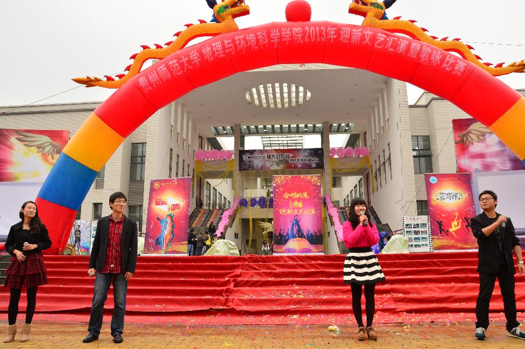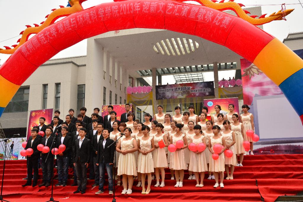 为迎接2013级新同学,丰富校园文化生活,10月18日下午,由地理与环境科学学院党委主办,学院团委、学生会及青分会承办的地理与环境科学学院2013年迎新文艺汇演暨“最美和声,唱响青春”歌咏比赛在花溪校区第一食堂前举行。学工部副部长胡长华,校团委副书记姚作舟,花溪校区管理办公室副主任吴波,地环学院党委书记杨建红、副院长殷红梅和赵翠薇,院党委副书记田伟、党委组织员郭锐、学院部分师生共1000余人参加此次文艺汇演暨歌咏比赛。