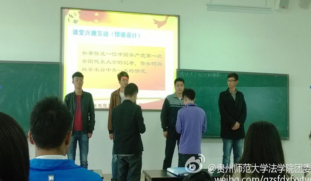 课上还进行了两次精彩的兴趣互动。其一是扮演代表,四位自愿上台的同学扮演了中国共产党第一次全国代表大会的列席代表,另三名同学扮演记者分别对四名代表进行现场采访并向社会报道一大的情况,七位同学临场发挥,表演精彩。其二是微博互访,要求同学们根据家乡的新变化、国家的新变化和国际地位的新变化围绕中国共产党的领导发表微博并@法学院团委进行互访交流,全班同学都积极参与其中。