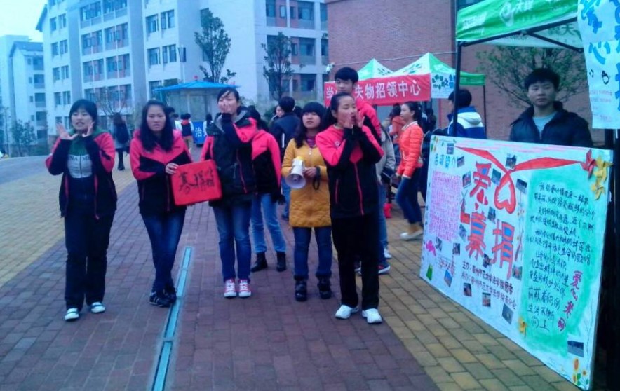 11月20日,由贵州师范大学法学院团委主办、青分会承办的爱心募捐活动在博学苑门口拉开序幕,活动主要面向花溪校区全体学生。此次募捐活动是为需要帮助的惠水县甲烈乡中心学校的贫困学生筹集善款,活动由青分会办公室主任吴国主持。