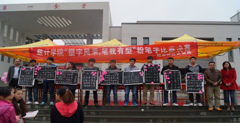 为了强化在同学们认真练习粉笔字的意识,切实提高在同学们的板书技能水平,数计学院于11月20日中午12:30在一食堂门前进行了“一周一主题,一院一特色”活动之“塑字风采,笔我有才”粉笔字比赛。此次比赛的评委老师有数计学院王炳江、熊胜兰老师,化材学院熊树林老师,数计学院各班学生代表作为此次比赛的大众评委。