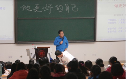 “转变作风提效能,创先争优促发展”主题实践活动的开展以来,教育科学学院党委根据2013-2014(一)教学中期座谈会中学生提出的意见,特邀请我院副院长何克教授在花溪校区给同学们举行一场特殊的“选修课”。11月22日下午,何老师在GJ6302教室为我院学生作了题为“做更好的自己---人生就是一场修行”专业讲座。我院三个年级应用心理学专业及其他专业部分同学共计200余人到场聆听了讲座。