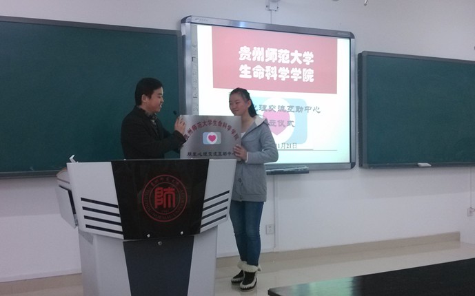 为加强我院学子心理健康教育的力度,使学生心理健康发展得到良好的引导,11月21日中午,由生命科学学院团委创建的朋辈心理交流互助中心在花溪校区GJ5204举行。生命科学学院团委副书记李伟、2013级辅导员龚记熠、刘学鑫出席了仪式,学院学生干部代表、各年级各班学生代表近70人参加了会议。仪式由我院“金话筒”主持人大赛冠军杨莹同学主持。