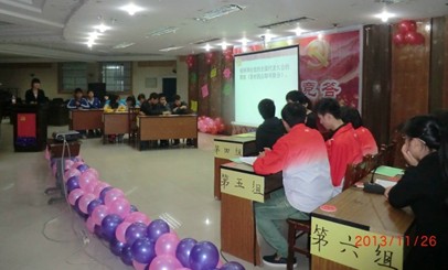 为深入贯彻党的十八届三中全会精神,引导学生党员、入党积极份子加深对党章、党史、党的基本理论和路线方针政策的了解,不断增强青年大学生建设中国特色社会主义的坚定性和责任感,材料与建筑工程学院于11月26日晚在综合楼211举行党的知识竞赛决赛。材建学院党总支副书记郑环、组织员粟灿辉、党总支秘书李婧、辅导员刘江、冉坤、陈皓等六位老师担任评委。