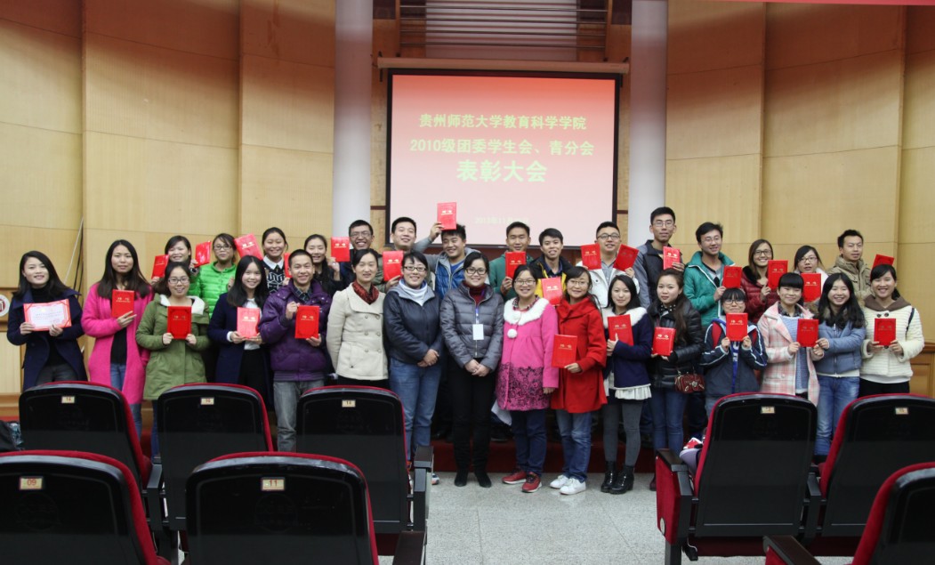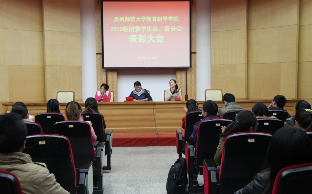 为表彰教育科学学院2010级团委学生会、青分会全体成员在过去两年里为我院团学工作所做出的贡献, 11月29日下午我院团委在田家炳书院三楼多功能厅召开了教育科学学院2010级团委学生会、青分会表彰大会。院团委书记高阳,副书记王小娅,专职辅导员郭腾飞,2010级团委学生会、青分会全体成员以及2013新一届学生会、青分会代表出席了本次会议。
