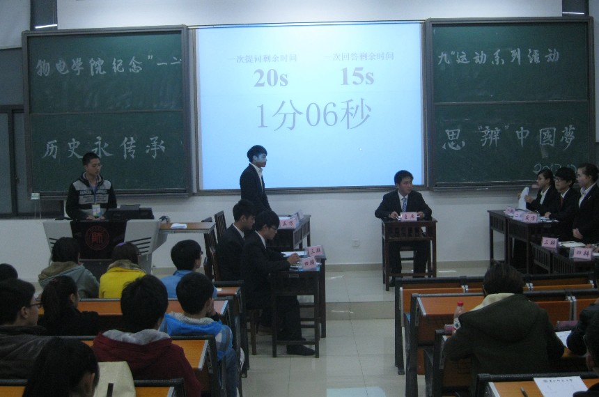 回溯历史,弘扬民族精神。为纪念“一二·九”运动78周年,12月8日晚,物理与电子科学学院在花溪校区公共教学楼2520举行以“历史永传承,思‘辩’中国梦”为主题的辩论赛。正方和反方围绕 “中国梦是注重于强国还是富民”的辩题展开激烈辩论。双方均对自身辩题有着深刻的理解,分别从社会发展的角度论及知与行的关系。在攻辩环节中,双方互不相让,将比赛推入高潮。正反双方旁征博引,将机智与幽默展现得淋漓尽致。最终13级物理(1)班和12级电子信息科学与技术班取得胜利。