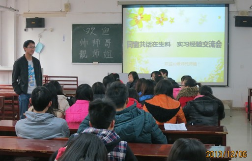 12月6日下午,生命科学学院于文科楼五楼举行了主题为“共话实习路 同铸中国梦”的实习经验交流会,会议邀请2010级实习期间表现优异的12位同学,参加本次活动的有2011级全体学生及辅导员崔荣荣。