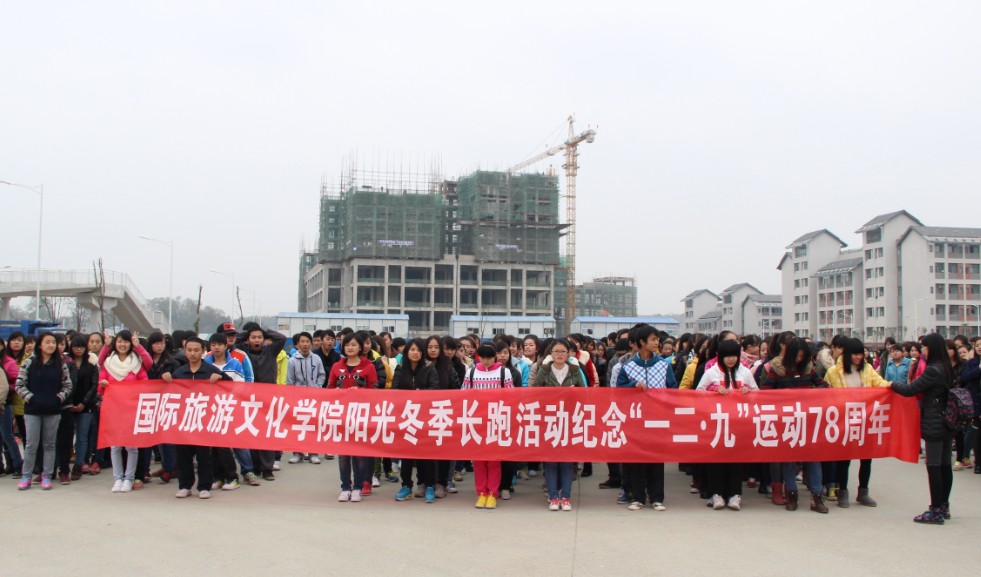 12月9日,为纪念“一二·九”运动78周年,国际旅游文化学院在花溪校区一号停车场举行以“阳光冬季”为主题的冬季长跑活动。国旅学院2012级、2013级学生全体参与了此次活动。院团委副书记陈豫魁主持活动,学工部夏天宣布活动正式开始。运动不仅能增强学生的体魄、磨练学生的意志,还能陶冶学生的情操,真在做到做到“每天锻炼一小时,健康工作五十年,幸福生活一辈子”,使同学们不仅是学习上的强者,同时也是生活上的赢家。跑步期间,大家也热烈交流了本次活动的相关内容及意义,并且回忆了在78年前的今天所发生的壮烈故事。