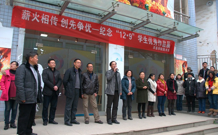 此次画展的目的是为弘扬中国传统文化,纪念12.9学生爱国运动,积极推动我院艺术文化发展,展示我院优秀艺术底蕴,大力弘扬学生爱国主义精神。开幕式由美术系行政系主任吴廷柱老师主持,首先他对本次作品展的内容表示满意,并对参展的每一位同学表示祝贺,因为这不仅是美术系的骄傲,更是求是学院的骄傲。他为参加本次画展从白忙之中抽身前来的领导表示感谢。