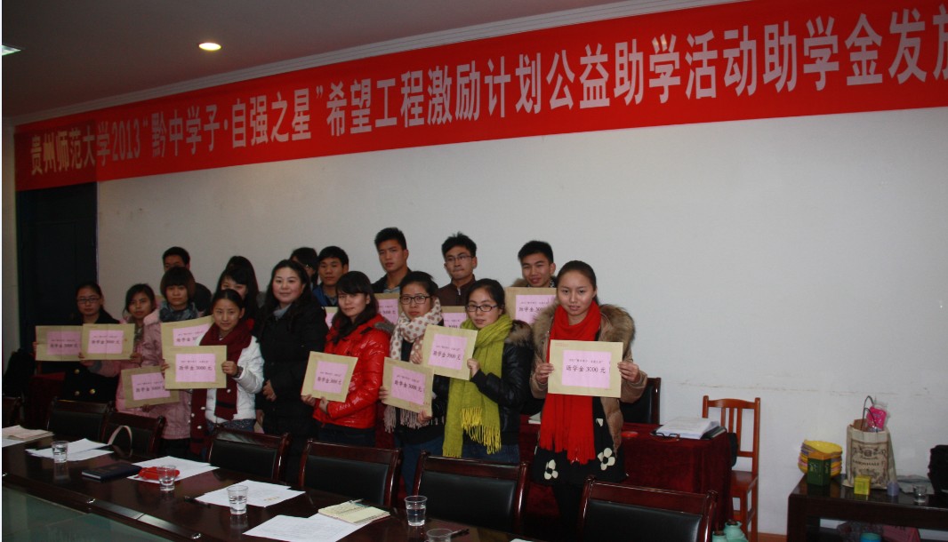 12月30日下午,贵州师范大学2013“‘黔中学子·自强之星’希望工程激励计划”助学金发放仪式在教务处会议室举行。校团委书记李娅出席仪式并为受助大学生发放助学金。各学院团委负责人及18名受助大学生参加了发放仪式。仪式由校团委办公室主任饶蕾主持。